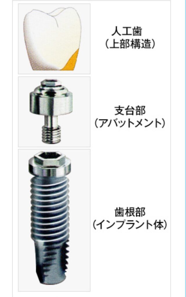 基本的には三つのパーツからできています。顎骨の中に埋め込まれる部分すなわち歯根部(インプラント体)、インプラント体の上に取り付けられる支台部(アバットメント)、歯の部分に相当する人工歯(上部構造)から構成されています。