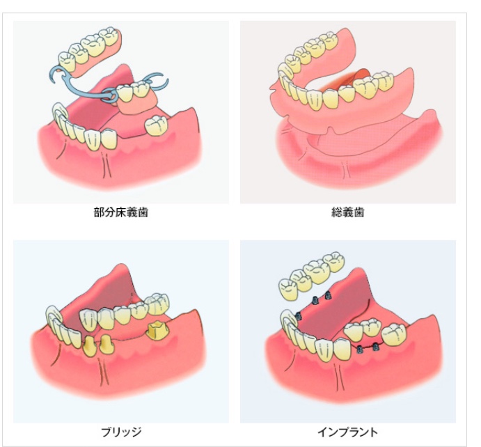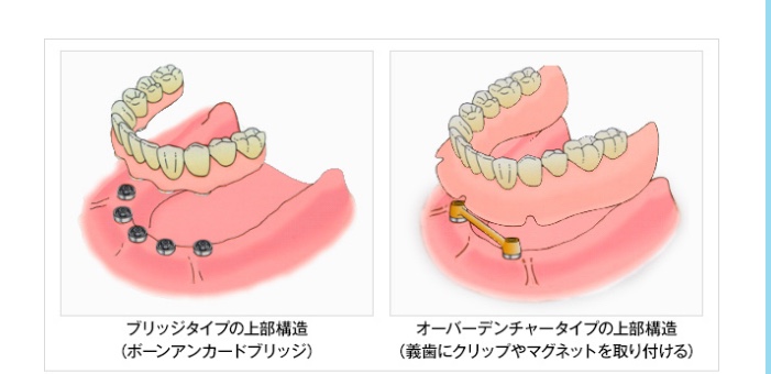 歯が全くない(無歯顎)場合、上部構造にはブリッジタイプ(ボーンアンガードブリッジ)とインプラントを利用した義歯(オーバーデンチャー)があります。インプラント体が4本以上埋め込まれた場合にはブリッジ、それ以下の場合にはオーバーデンチャーになります。ただし、費用を抑える場合や高齢者などにおいて手術侵襲をできるだけ小さくする必要がある時には、オーバーデンチャーが選ばれます。部分的に歯がない場合の多くはブリッジタイプですが、最近オーバーデンチャータイプも装着されるようになりました。