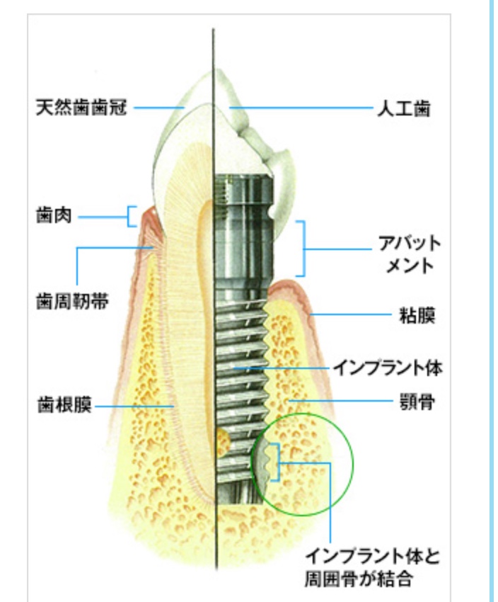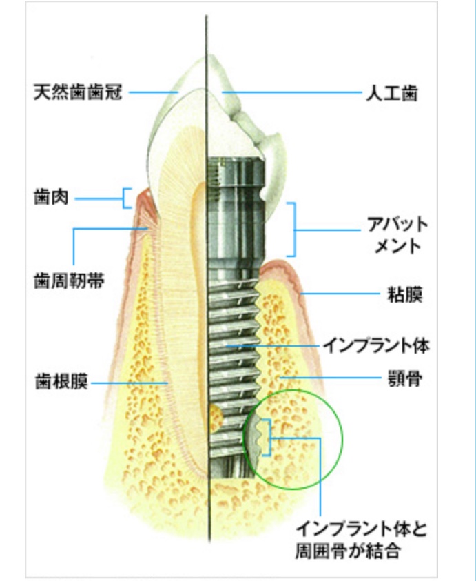 インプラント体と周りの骨とは隙間がなく、くっ付いた状態です。一方、天然歯の歯根の周りにはクッションの役割を担う歯根膜というコラーゲン繊維があります。そのため、噛むと歯はわずかに沈み込みます。またこの中には、かんだ時にかかる圧力を鋭敏に感知して、噛む力をコントロールするためのセンサー(受容器)もあります。インプラントにはこのようなクッションもセンサーもありません。骨の弾力によるほんの僅かな沈み込みしか生じません。かむ力はあごの骨の周りの骨膜、かむための筋肉、あごの関節などにあるセンサーによってコントロールされますが、歯根膜にあるセンサーに比べ「感度」が劣るため、かみ合わせには十分に注意する必要があります。 また、インプラントの周りの粘膜(歯の場合は歯肉)は天然歯と異なっています。天然歯では、歯肉はエナメル質と付着上皮と呼ばれる部分で、その下の結合組織はセメント質と結合し、細菌などが容易に侵入できないようになっています。インプラントにはそのような構造はなく、細菌は容易にインプラント周囲に侵入しやすい構造となっております。しかし臨床的には天然歯と比べて極端に感染しやすいことはありません。