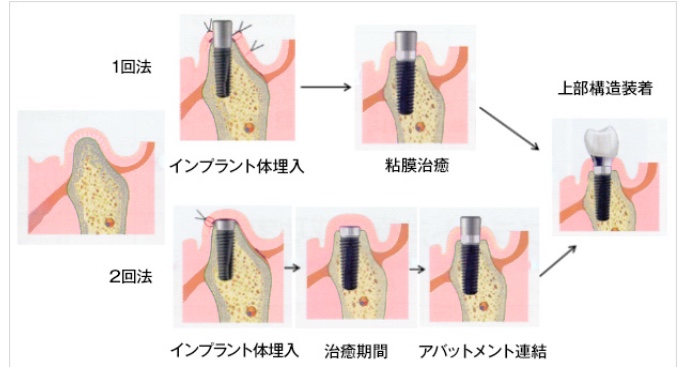 1回法と同じようにしてインプラント体を埋め込んだ後、上部の穴にカバーを付けます。切開した粘膜を糸で縫い合わせて1回目の手術は終了です。インプラント体と骨が結合するまで2カ月-6ヶ月後(治癒期間)、2回目の手術を行います。カバーの上の粘膜を切開して、カバーを除去後仮のアバットメント(ヒーリングアバットメント)を連結します。粘膜の治癒を2~3週間待って、本物のアバットメントを連結します。骨の量が十分にあり硬い場合には1回法でも問題はありませんが、骨の量が少なく骨移植が必要だったり骨が軟らかい場合には2回法が行われます。