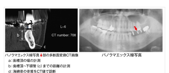 インプラント治療はインプラント体を顎骨に埋め込むため、顎骨の状態を三次元的に正確に把握する必要があります。 CTは多方向からX線を照射してコンピューターで画像解析ができるため三次元的な診断ができます。手術後の神経麻痺などのトラブルを防ぐためにも必要な検査です。