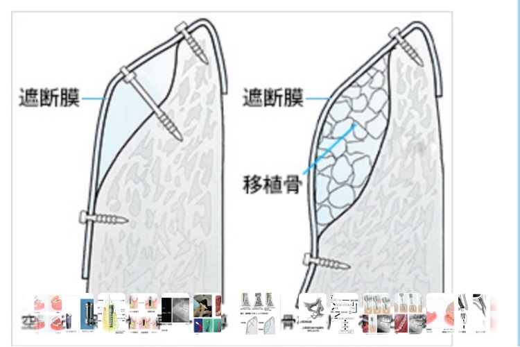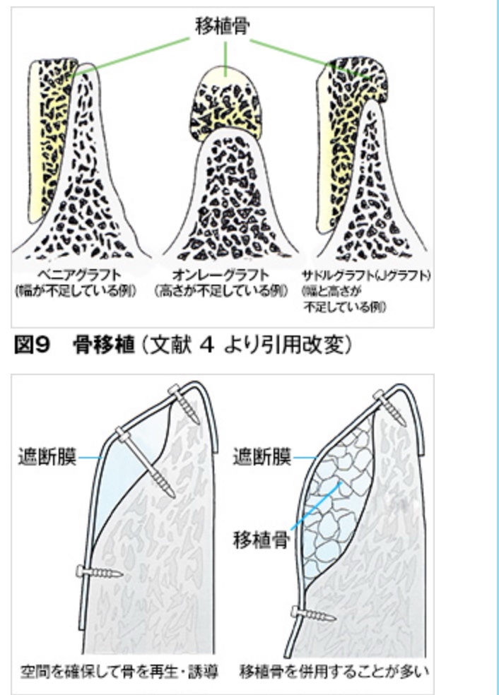 長年の義歯の装着により顎骨が痩せてしまったり、抜歯後放置していたため顎骨が吸収したり、腫瘍などのため顎骨の一部を失った患者さんでは、インプラント体を埋め込むのに必要な骨が不足していることがあります。そのような場合には足りない骨を補う「骨造成」が必要になります。それには、骨移植法、骨再生誘導法(GBR法)、上顎洞底挙上法(サイナスリフト)、などがあります。骨移植法は下あごの後方などから骨を採取し、インプラント体を埋め込む予定部位へ移植する方法です。自家骨移植では移植骨を採取するための手術が必要となりますが、それを避けるには人工骨を用いる方法もあります。 GBR法は骨造成が必要な部位に特殊な薄い膜(遮断膜)を置いて周囲粘膜が侵入しない空間を確保して骨の再生を図る方法です。サイナスリフトは、上顎の臼歯部において上顎洞という空洞までの骨が不足している場合に行われる方法で、上顎洞の底の粘膜(上顎洞粘膜)を持ち上げてできた空洞に自家骨あるいは人工骨を移植する方法です。インプラント体1本分の上顎洞底の粘膜を持ち上げるソケットリフトもあります。骨造成法を用いた場合、移植骨が定着するまで4~6カ月かかるためインプラント治療が終了するまでには時間がかかりますし、費用も20~40万円ほど余分にかかります。