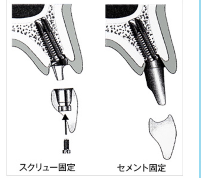 - ブリッジなどを装着する時などに用いるセメントで固定します。ねじを用いないため見た目はよいのですが、基本的には取り外しができないので修理やインプラントの診査などができない欠点があります。