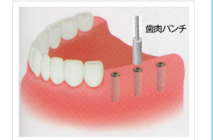 インプラント体を埋め込む際には、粘膜を切開して骨を露出しますが、粘膜を切開する代わりに、埋め込む部位に歯肉パンチで穴を開けてインプラント体を埋め込む方法です。切開をしないため、手術時間が短くて済み、痛み、腫れがほとんどありません。従来の粘膜を切開して骨を露出させる方法では骨の状態を肉眼で確認できますが、それができないためCTなどによって骨の状態を十分に把握した上で行うことが重要になります。