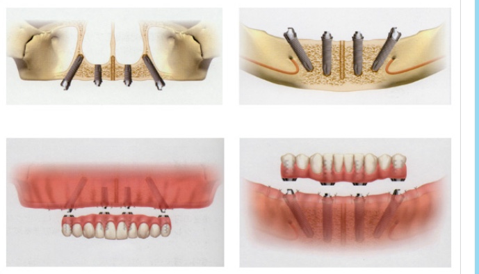 全ての歯を失った状態(無歯顎)のインプラント治療で、小臼歯間にフラップレスで4本インプラント体を埋め込み(4本のうち2本は傾斜させます)、同時に上部構造を装着する方法です。手術時間は1時間程度で済み、痛みや腫れも少なく、その日から軽い食事ができ、費用も安く済む方法ですが、CT検査で利用できる骨の量や形態をコンピューターで分析し、インプラント体を最適な位置や角度に埋め込むと同時にCTデーターを基に仮の上部構造を予め製作して装着するため、難易度が高い方法です。